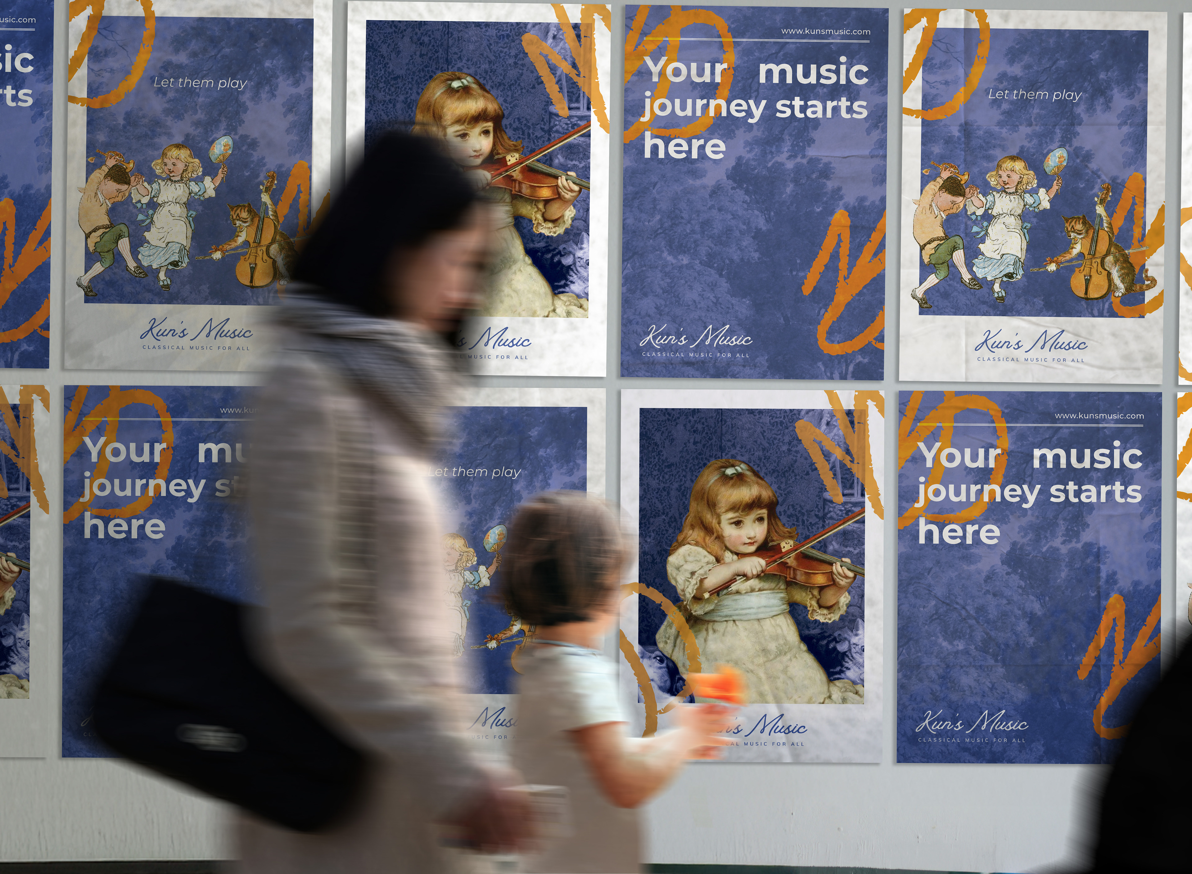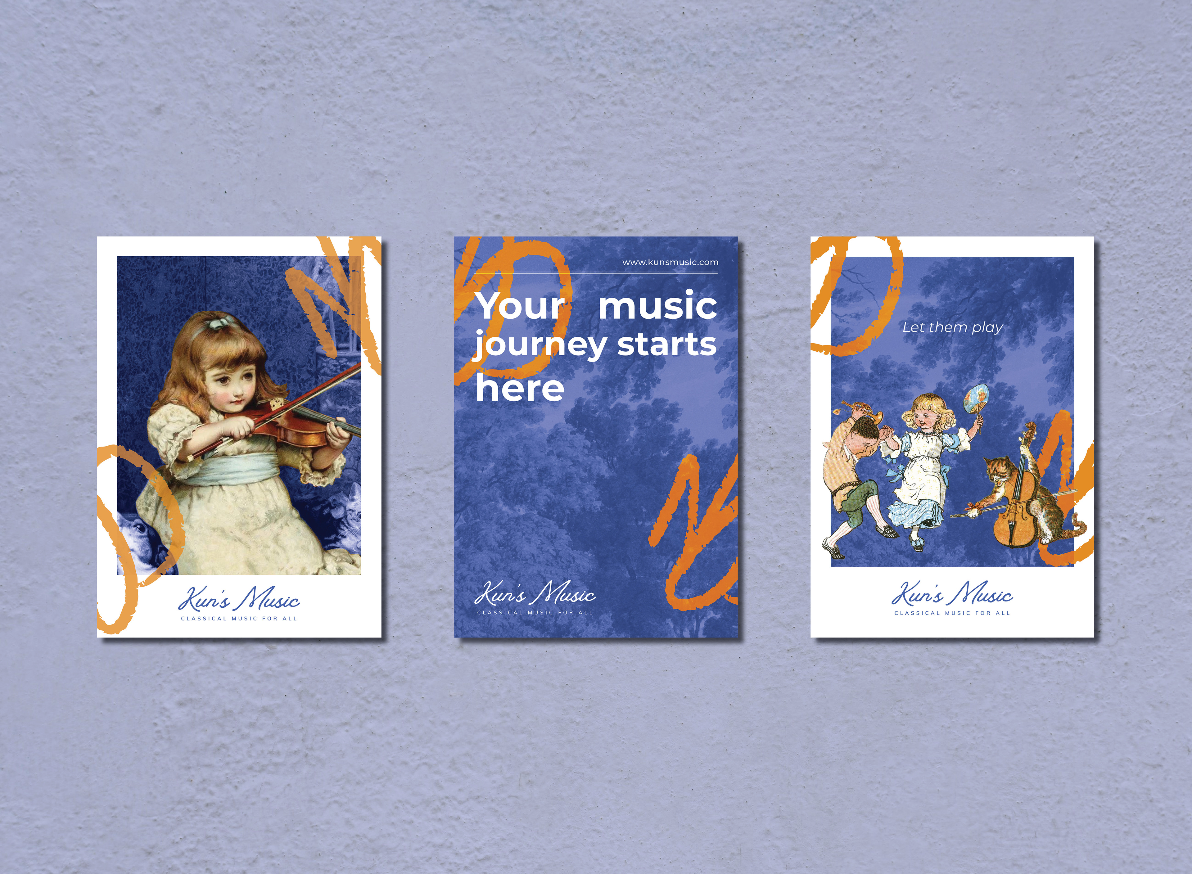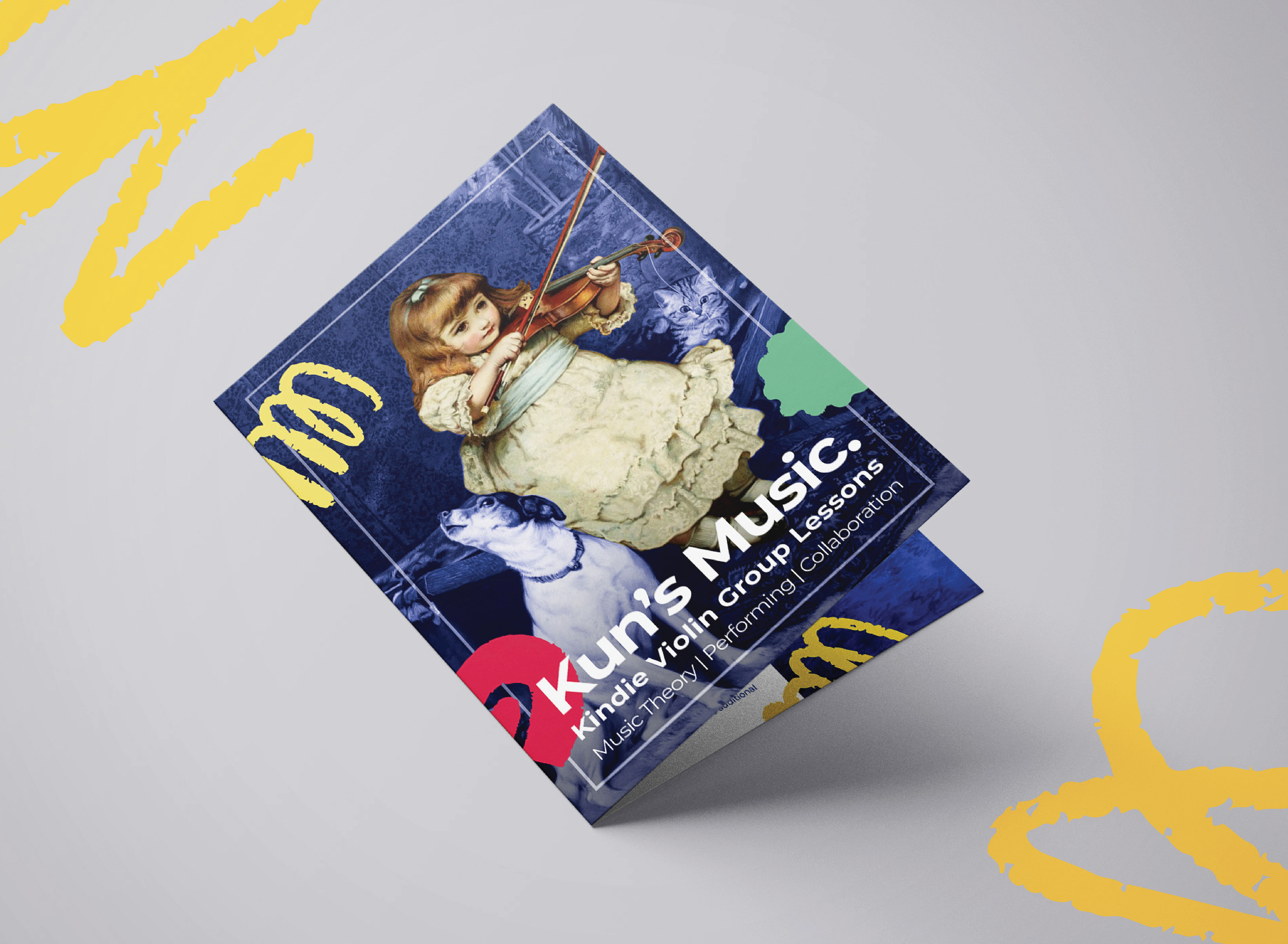 Promotion material and brand identity designed for 'Kun's Music School'. The school focuses in classical music education for kids. Wanting to capture the 'classical' aspect of classical music yet capture the playfulness of children, I've used classical oil paintings/ illustrations as base and combined photo collage techniques and overlayed with modern vibrant colours. A Chinese version is also created for Chinese families, sharing the same format and information.